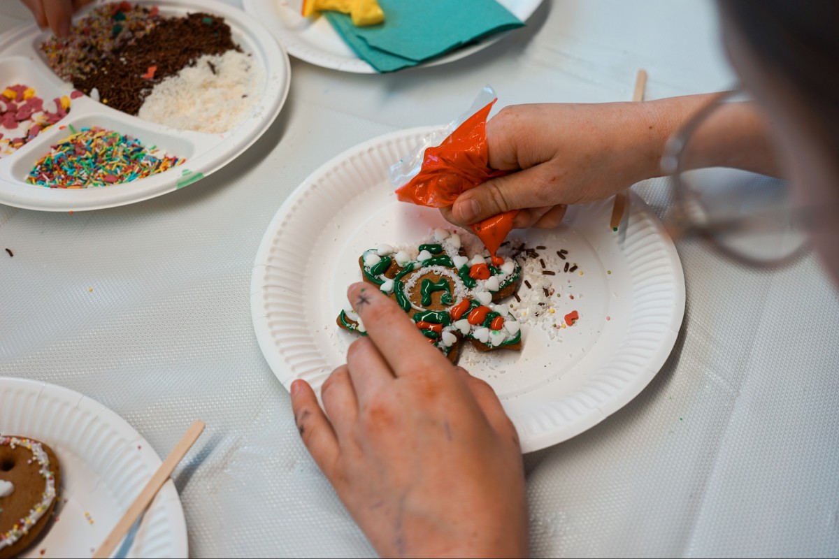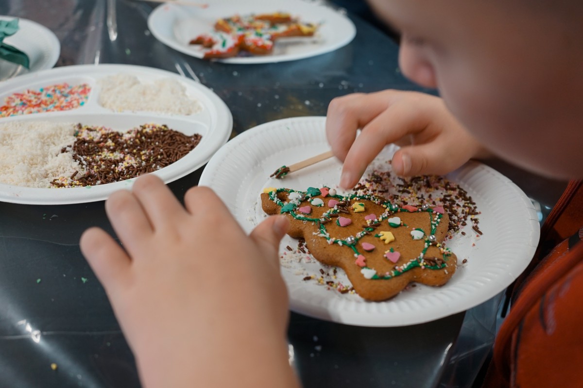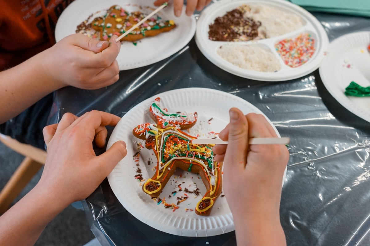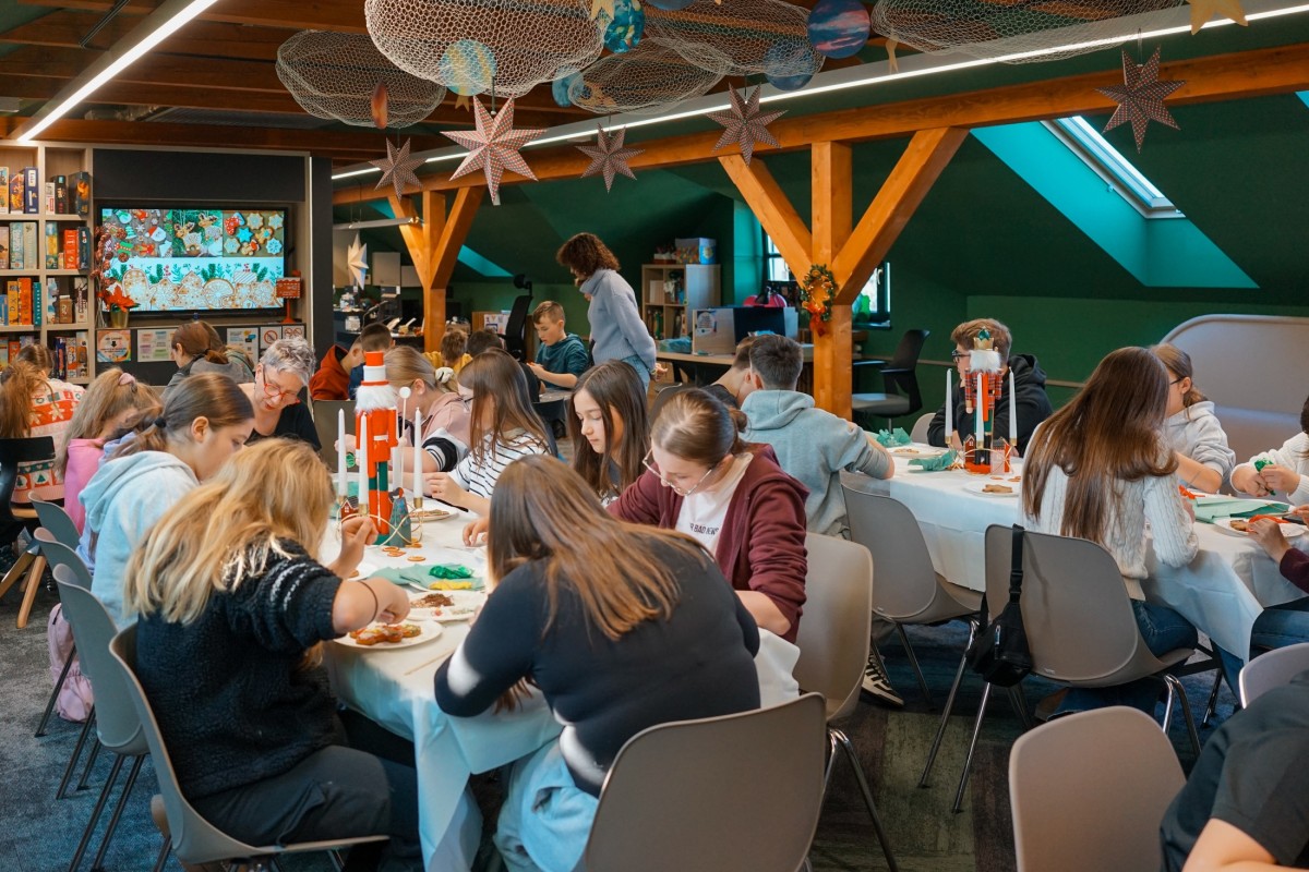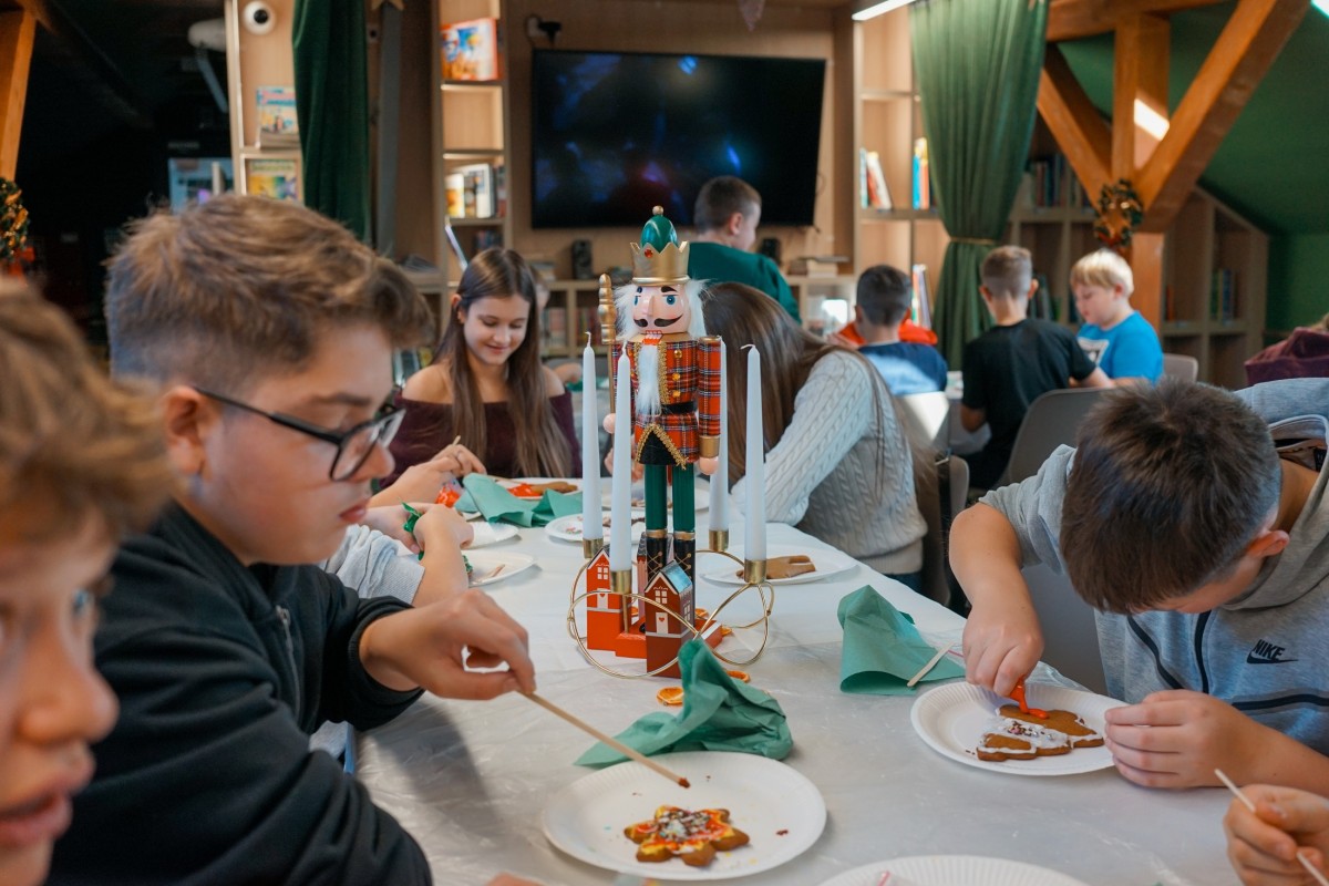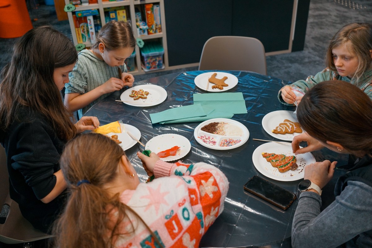 Finałem wizyty była część integracyjno-warsztatowa. Jedna z sal Mediateki zamieniła się w świąteczną wioskę, w której każdy z uczestników otrzymał pierniki do samodzielnego dekorowania.