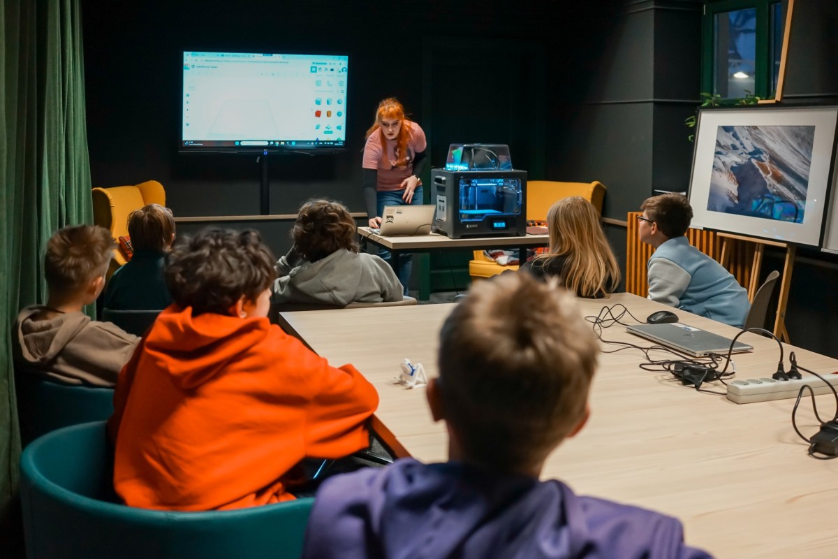 Wczoraj, w filii Mediateka, odbyły się warsztaty pt. „Od pomysłu do wydruku” dla dzieci w wieku 11-13 lat. Spotkanie rozpoczęliśmy od krótkiego wprowadzenia teoretycznego, odpowiadając na pytania: jak zbudowana jest drukarka 3D?, czym jest filament? i jak go przetopić?