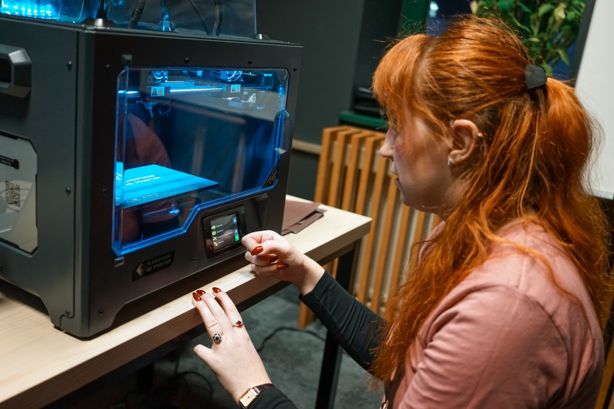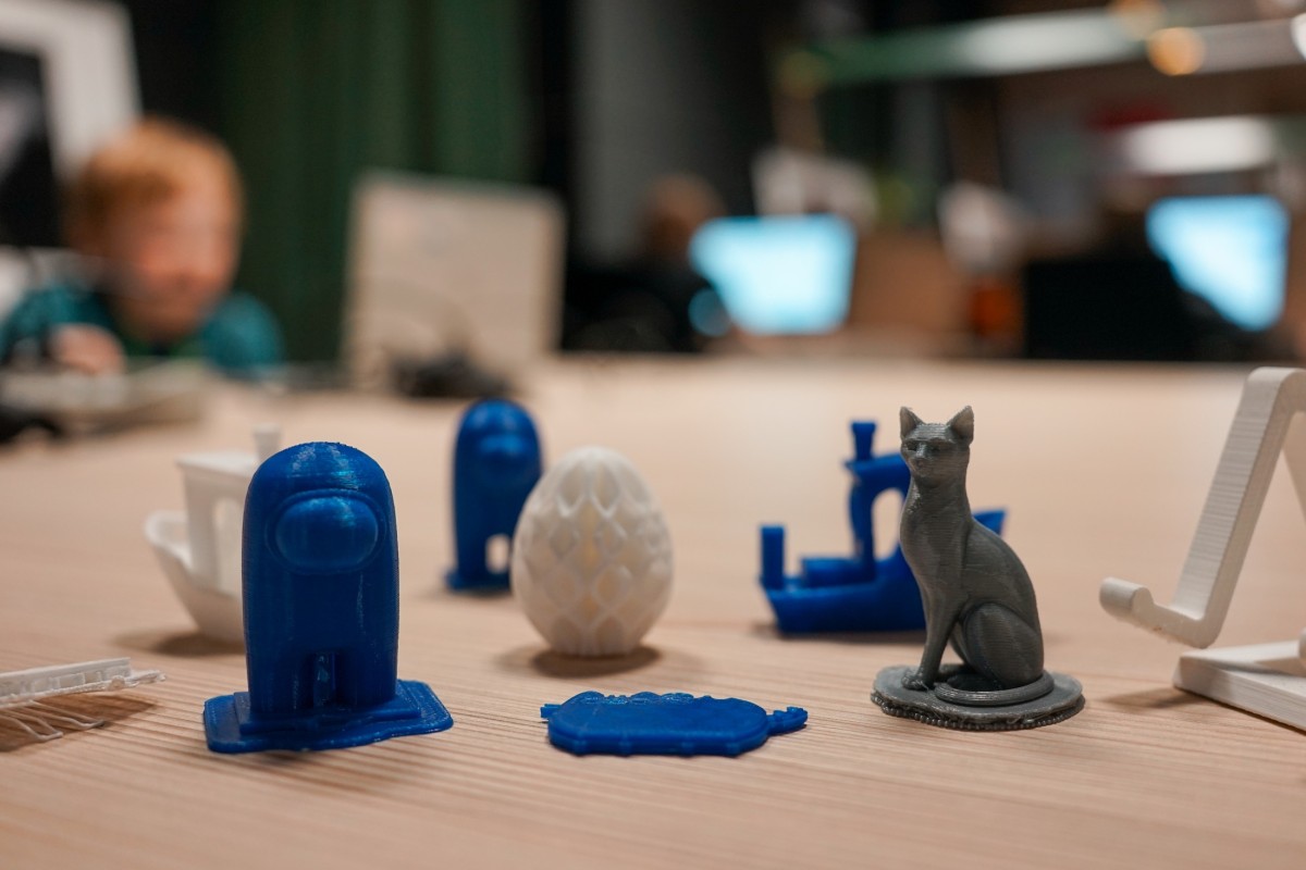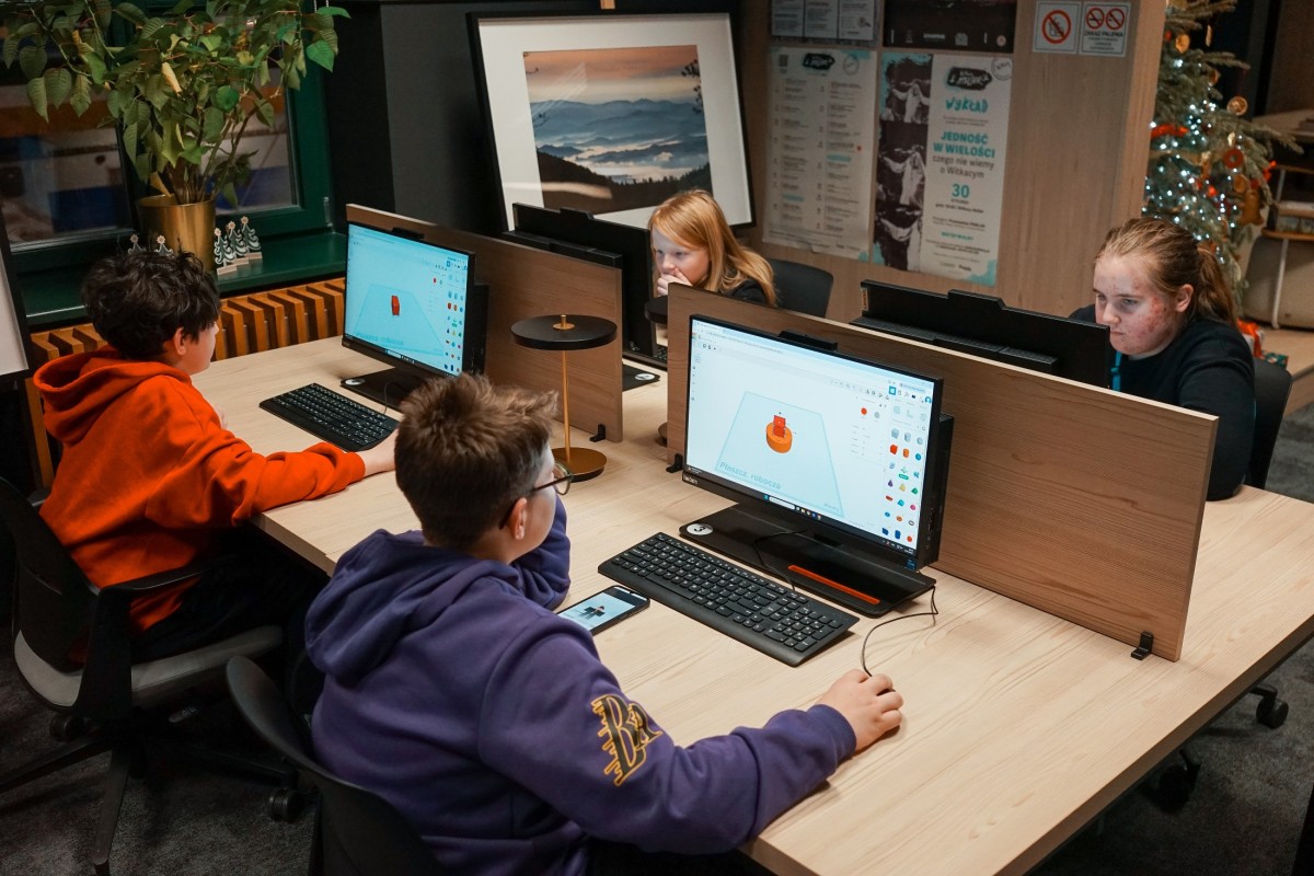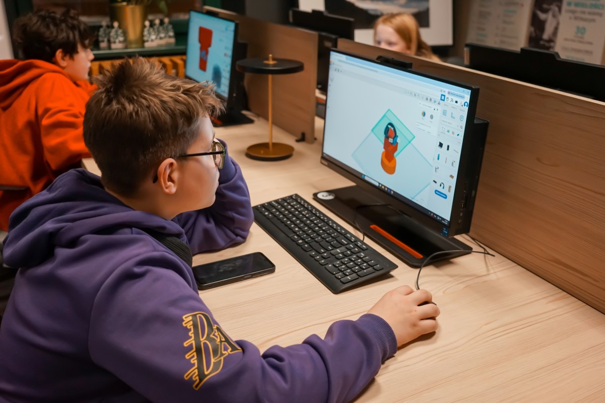 W dalszej części zajęć dzieci przystąpiły do projektowania własnych modeli. Równolegle trwał druk przykładowych figurek, co pozwoliło uczestnikom na bieżąco obserwować pracę drukarki i zobaczyć, jak cyfrowe projekty stopniowo nabierają realnych kształtów.