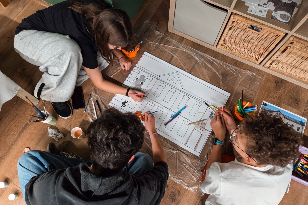 Uczestnicy warsztatów zapoznali się z pojęciem „Street-Artu”, poznali kilka jego form jak graffiti, instalacje przestrzenne, czy „yarnbombing”, a następnie wysłuchali historii muralu oraz instrukcji – krok po kroku – jak stworzyć tego typu dzieło. Po części teoretycznej każdy uczestnik otrzymał kartę ze szkicem fasady Mediateki, która posłużyła jako baza do stworzenia własnego projektu muralu.