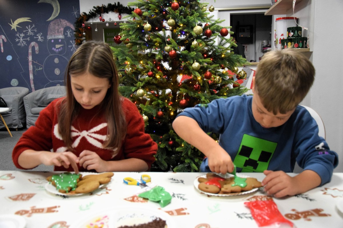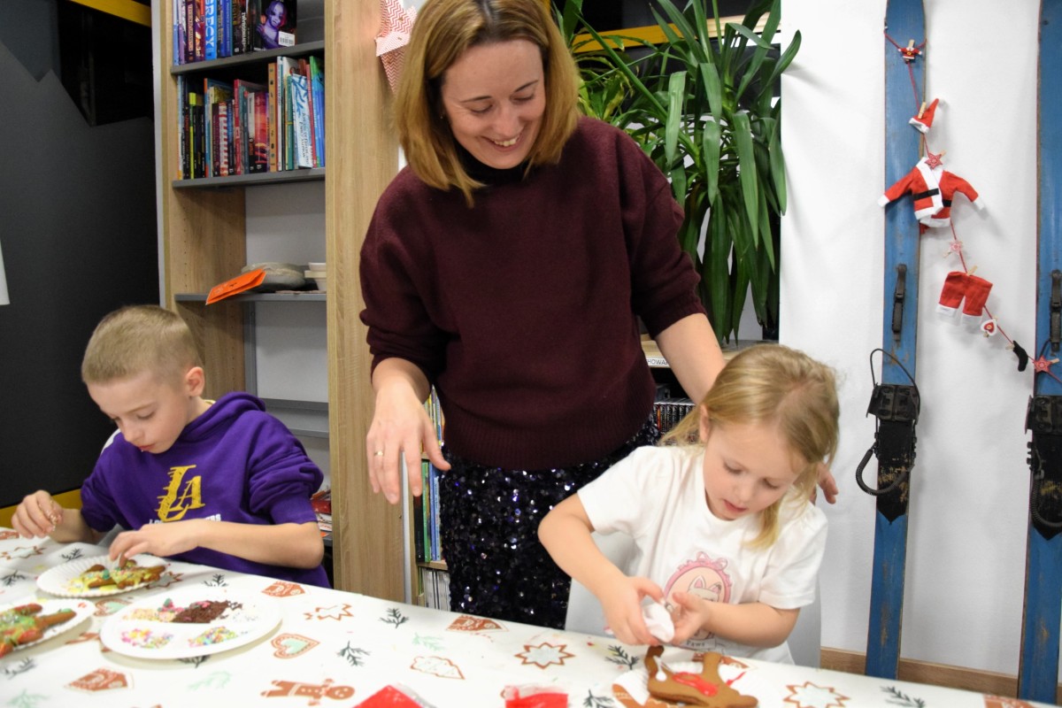 Dzieci i rodzice z ogromnym zaangażowaniem dekorowali pachnące pierniczki oraz wspólnie ubierali choinkę, która dzięki nim nabrała wyjątkowego, świątecznego blasku. Nie zabrakło też chwili z literaturą — czytaliśmy fragment książki Daniela Nappa „Pan Brumm obchodzi Boże Narodzenie”. Ta ciepła i pełna humoru historia wywołała mnóstwo uśmiechów i pięknie dopełniła świąteczny nastrój.