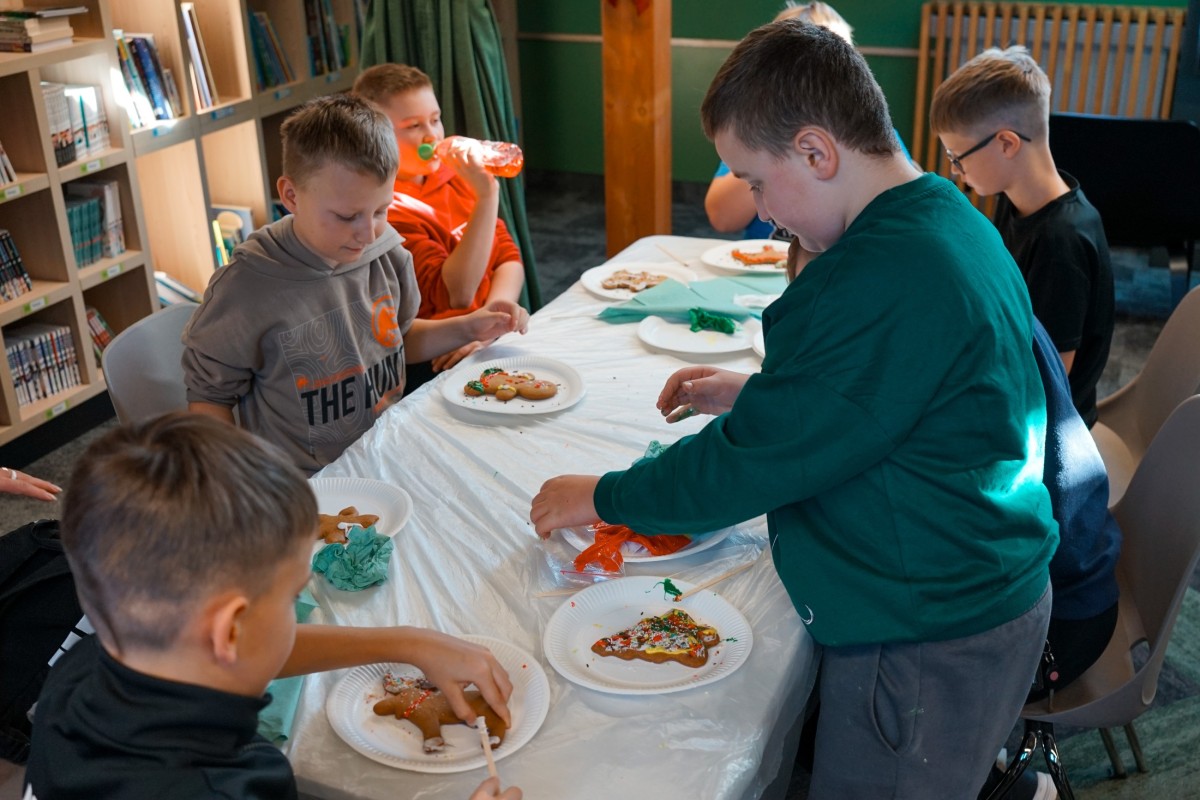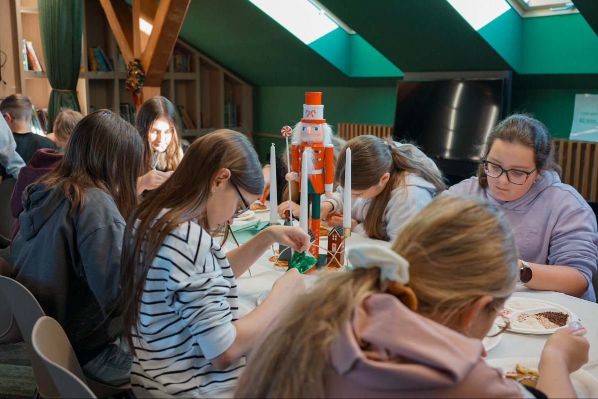 Finałem wizyty była część integracyjno-warsztatowa. Jedna z sal Mediateki zamieniła się w świąteczną wioskę, w której każdy z uczestników otrzymał pierniki do samodzielnego dekorowania.