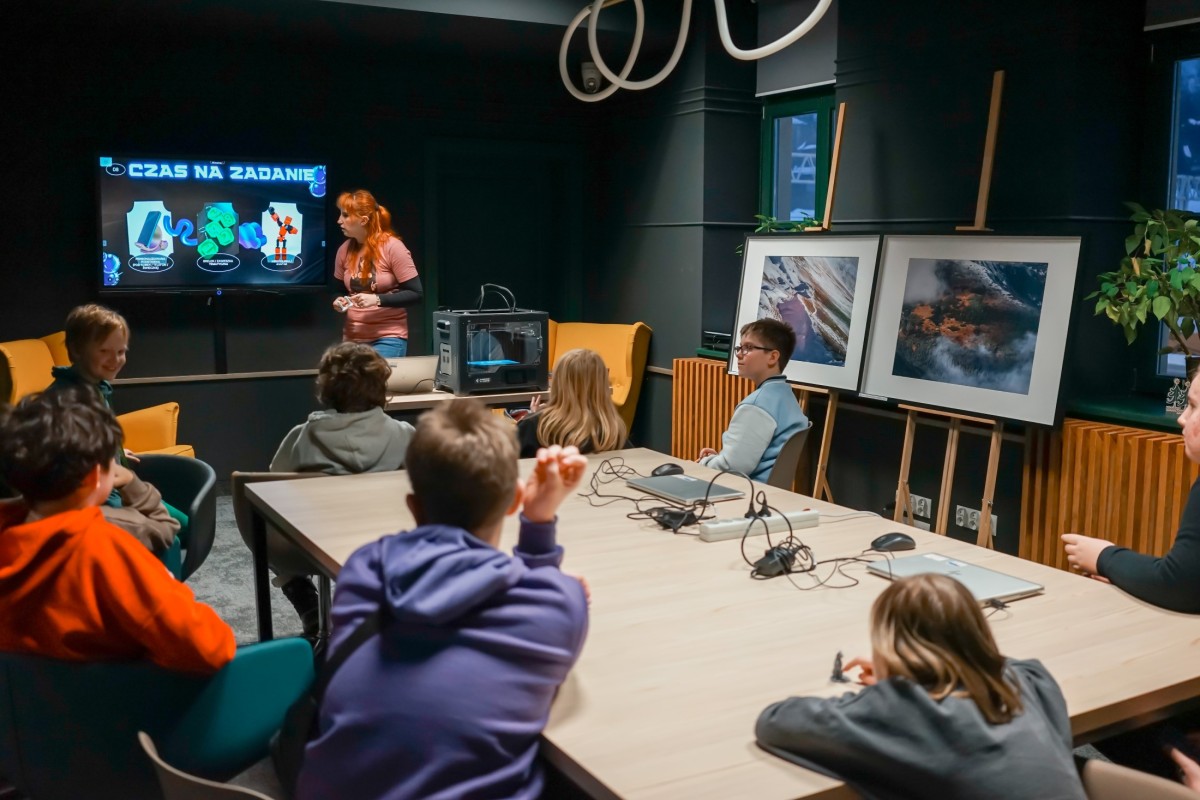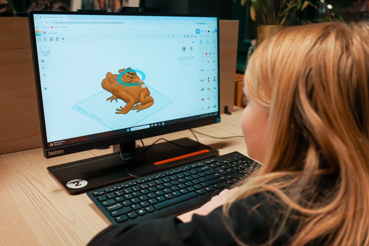 W dalszej części zajęć dzieci przystąpiły do projektowania własnych modeli. Równolegle trwał druk przykładowych figurek, co pozwoliło uczestnikom na bieżąco obserwować pracę drukarki i zobaczyć, jak cyfrowe projekty stopniowo nabierają realnych kształtów.